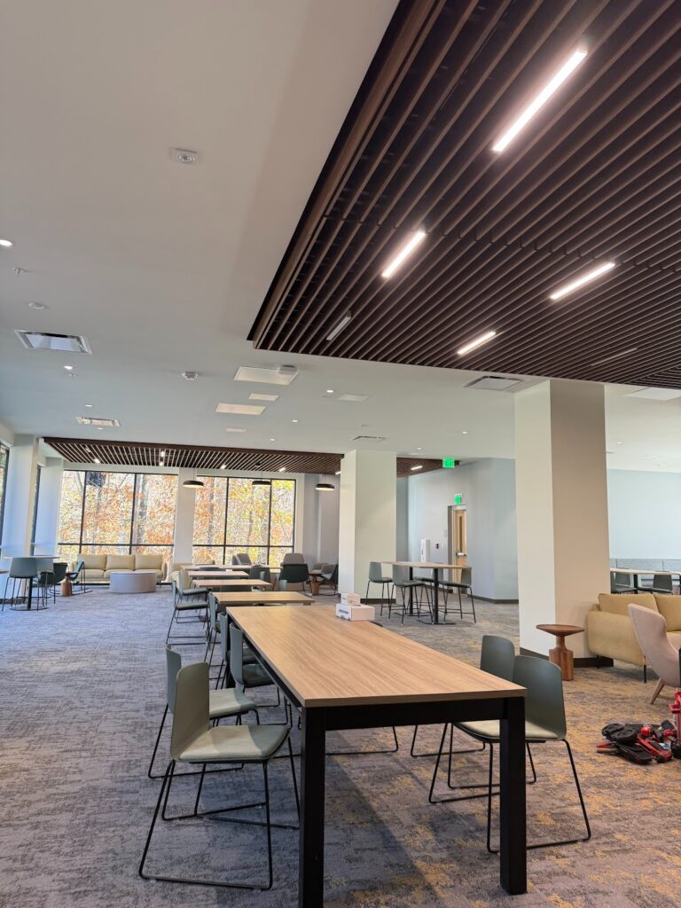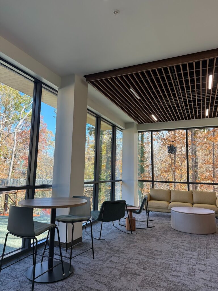 One thing that struck both of us is how much nature is implemented into the designs with tons of outdoor seating, forest-inspired coloring, and lots of natural light. Each hall has its own color, lining the halls and carpeting the study room floors. I cannot wait to see the transformation of campus with all of these new dorms and dining hall!